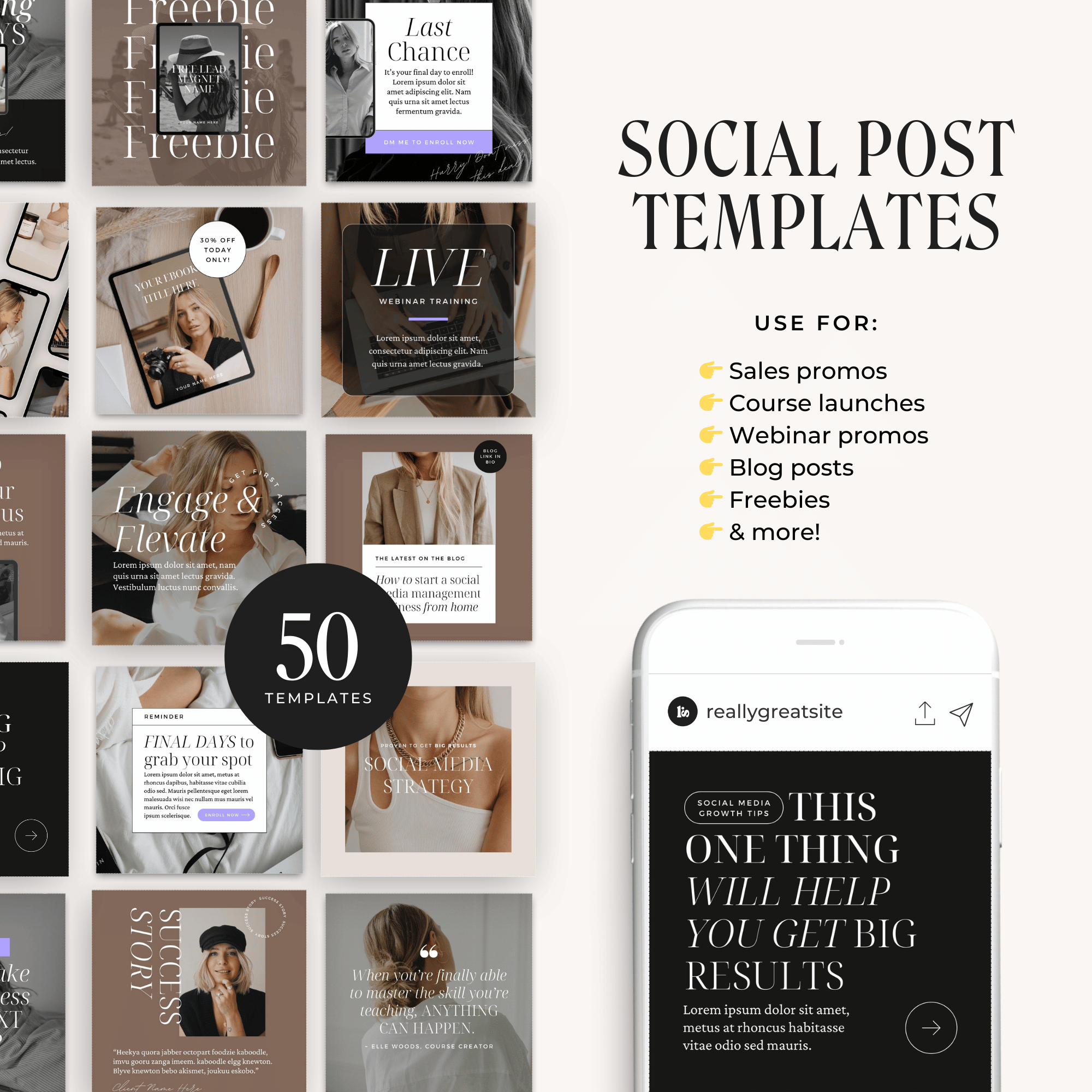Use the social graphic templates in 3 size options (IG post, IG story & Pinterest) to promote your offers, share your freebies, engage with your audience and expand your reach.