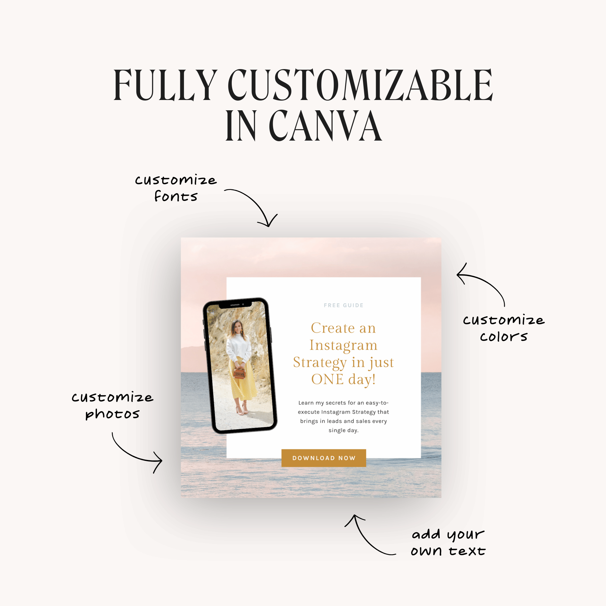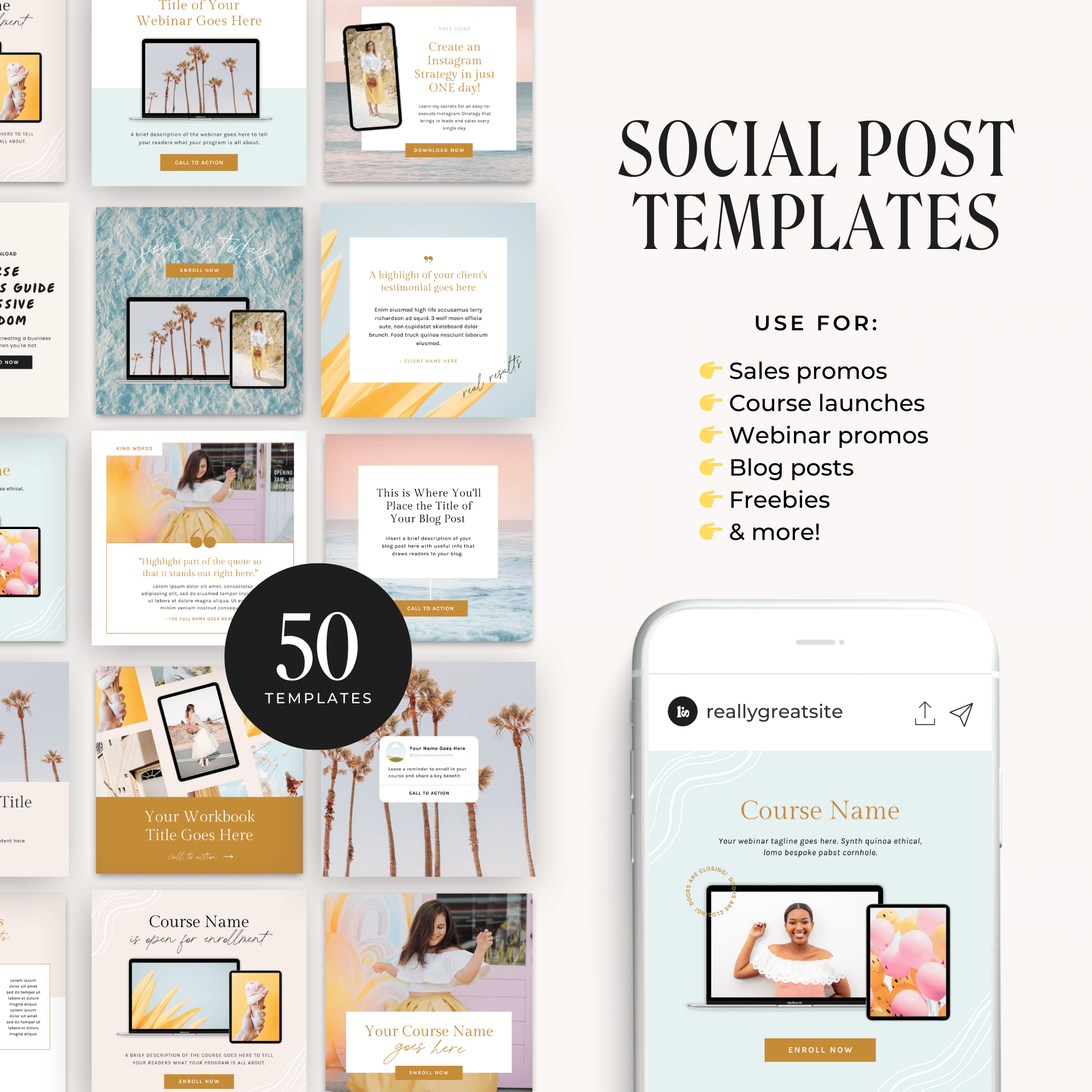 Use the social graphic templates in 3 size options (IG post, IG story & Pinterest) to promote your offers, share your freebies, engage with your audience and expand your reach.