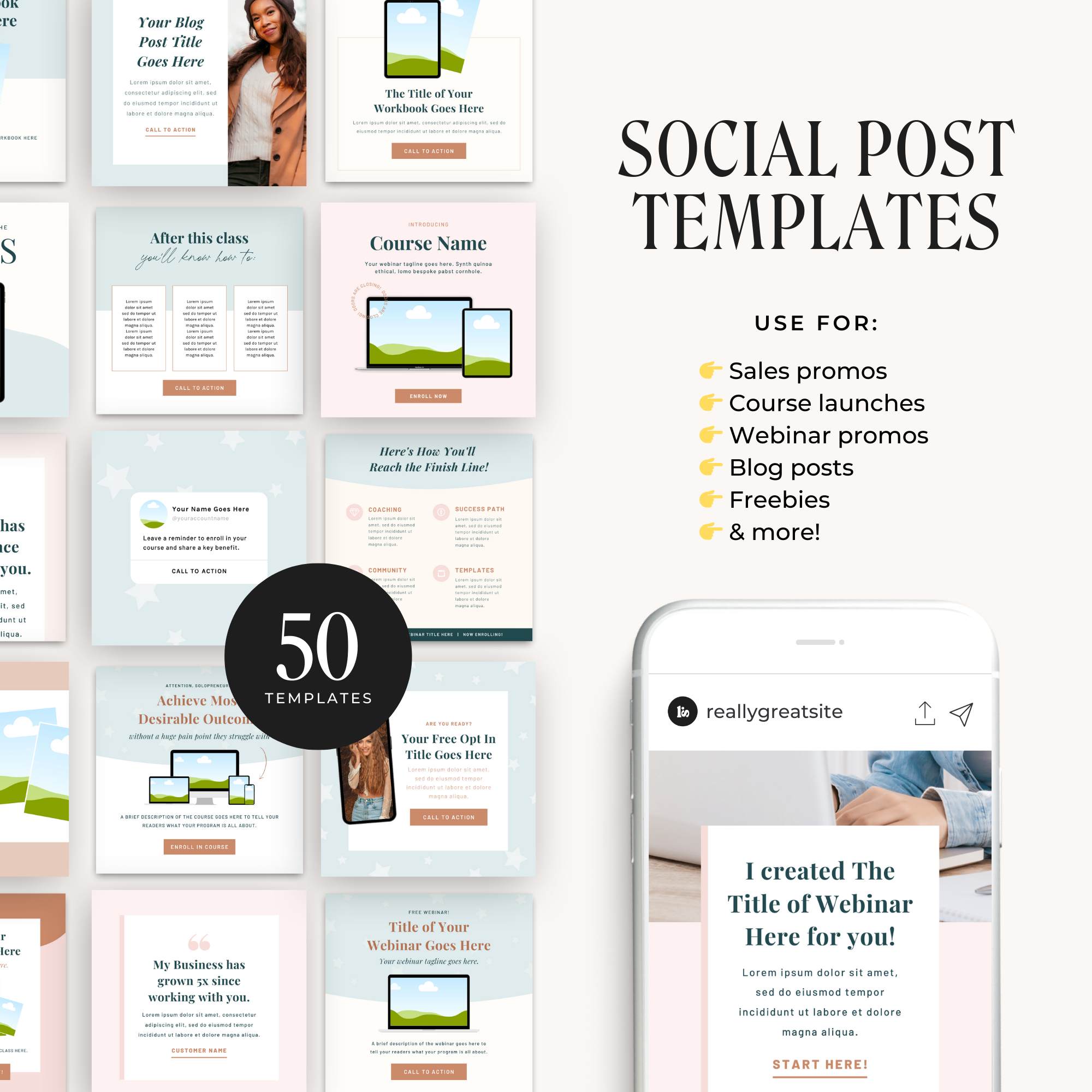 Use the social graphic templates in 3 size options (IG post, IG story & Pinterest) to promote your offers, share your freebies, engage with your audience and expand your reach.