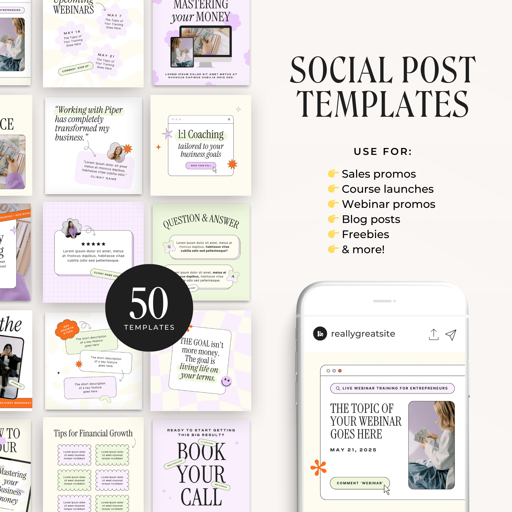 Use the social graphic templates in 3 size options (IG post, IG story & Pinterest) to promote your offers, share your freebies, engage with your audience and expand your reach.