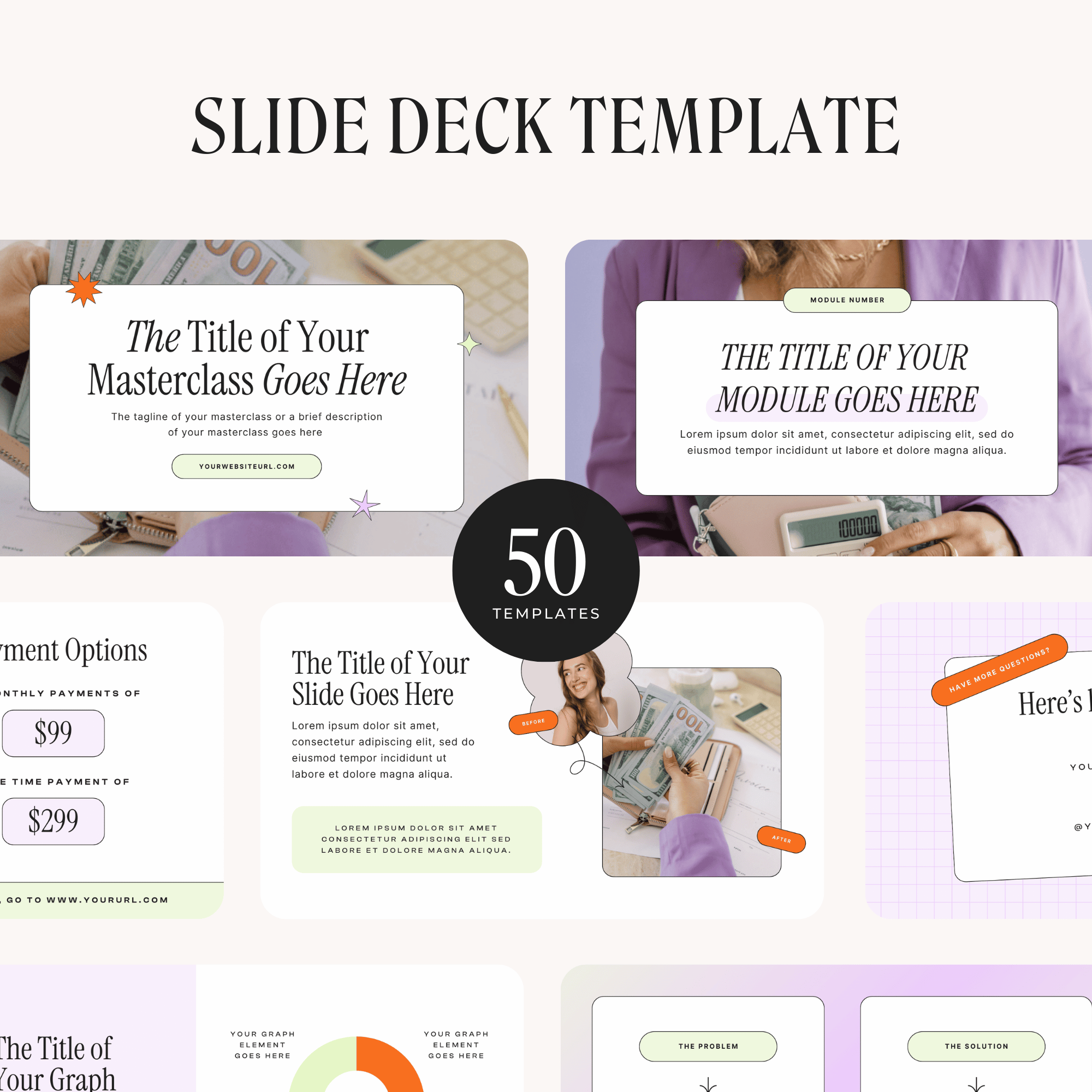 Use the slide deck template to host live webinars, create summit content and record lesson content for your digital offers.