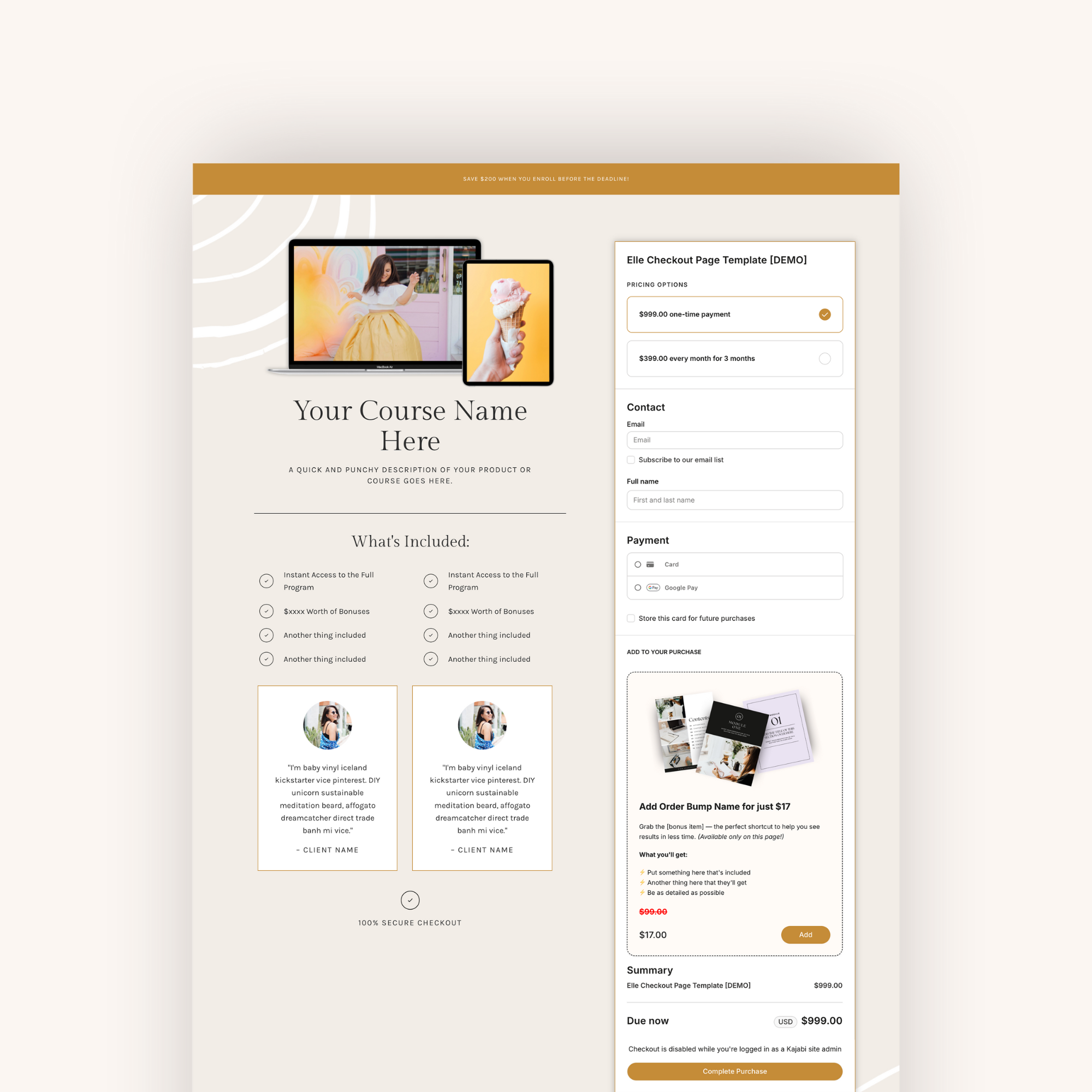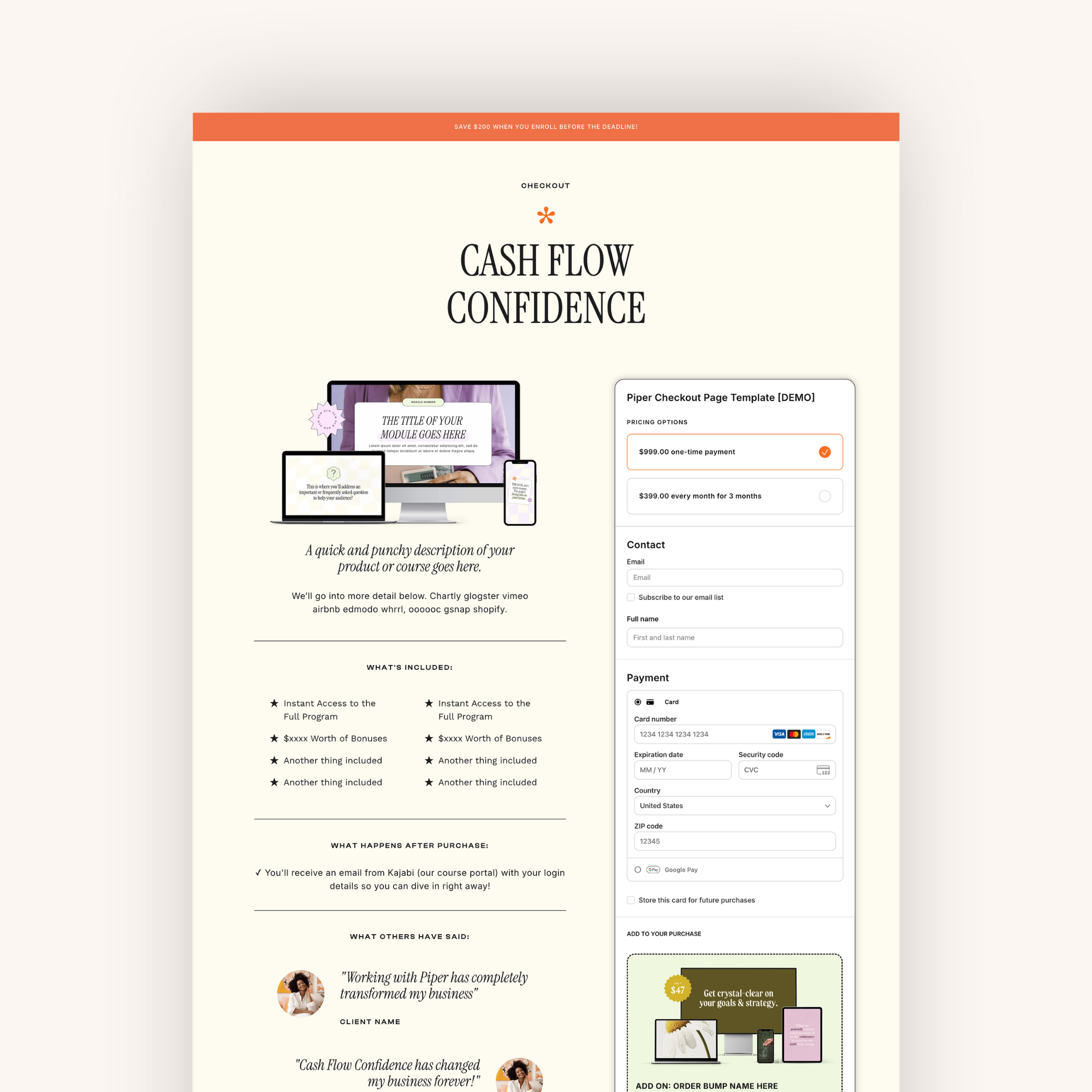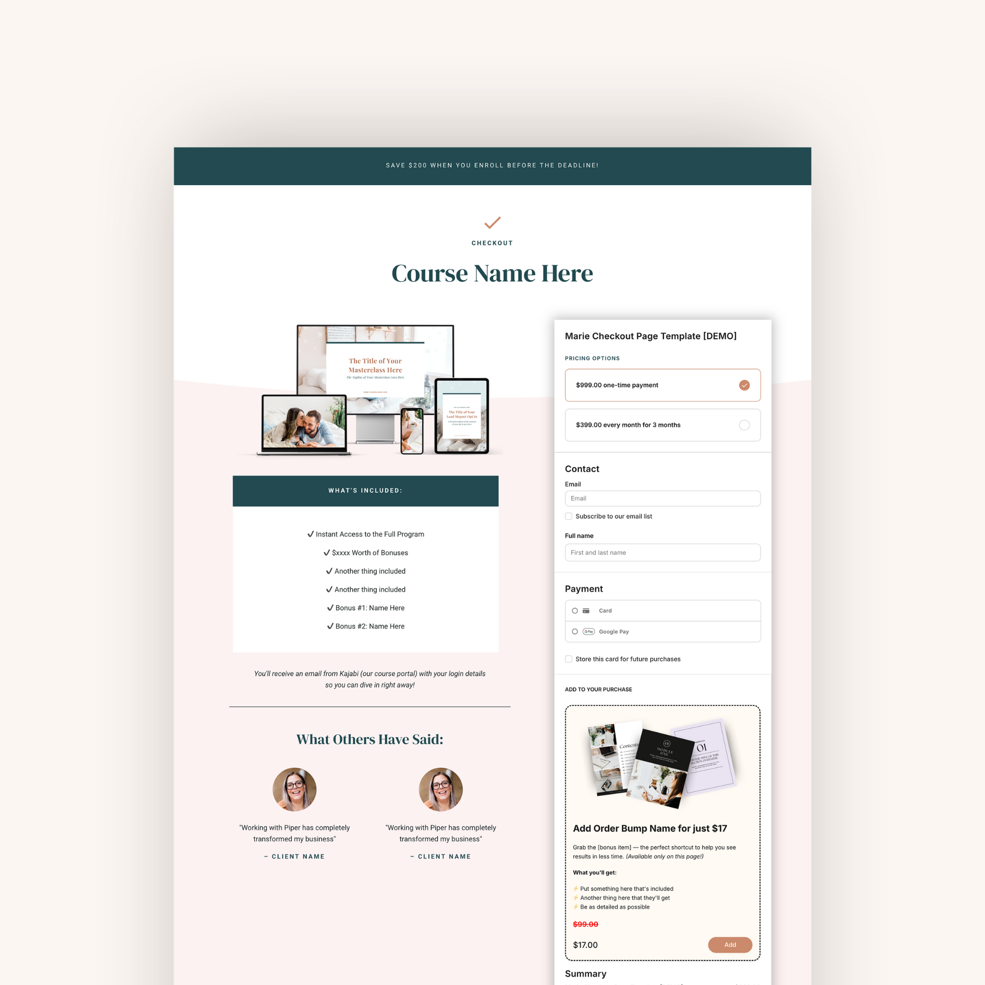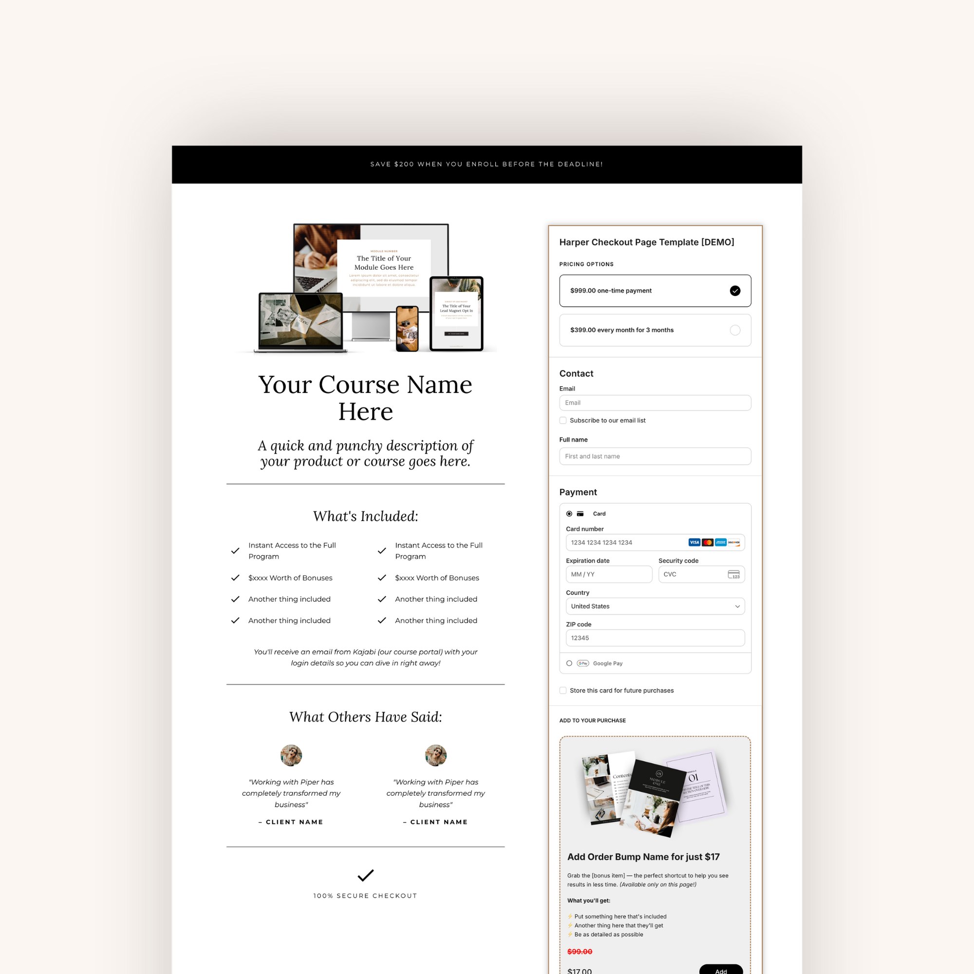Each template includes a clean, strategic layout with space for offer details, trust builders, and an order bump—fully customizable inside Kajabi and perfect for courses, memberships, and digital products.