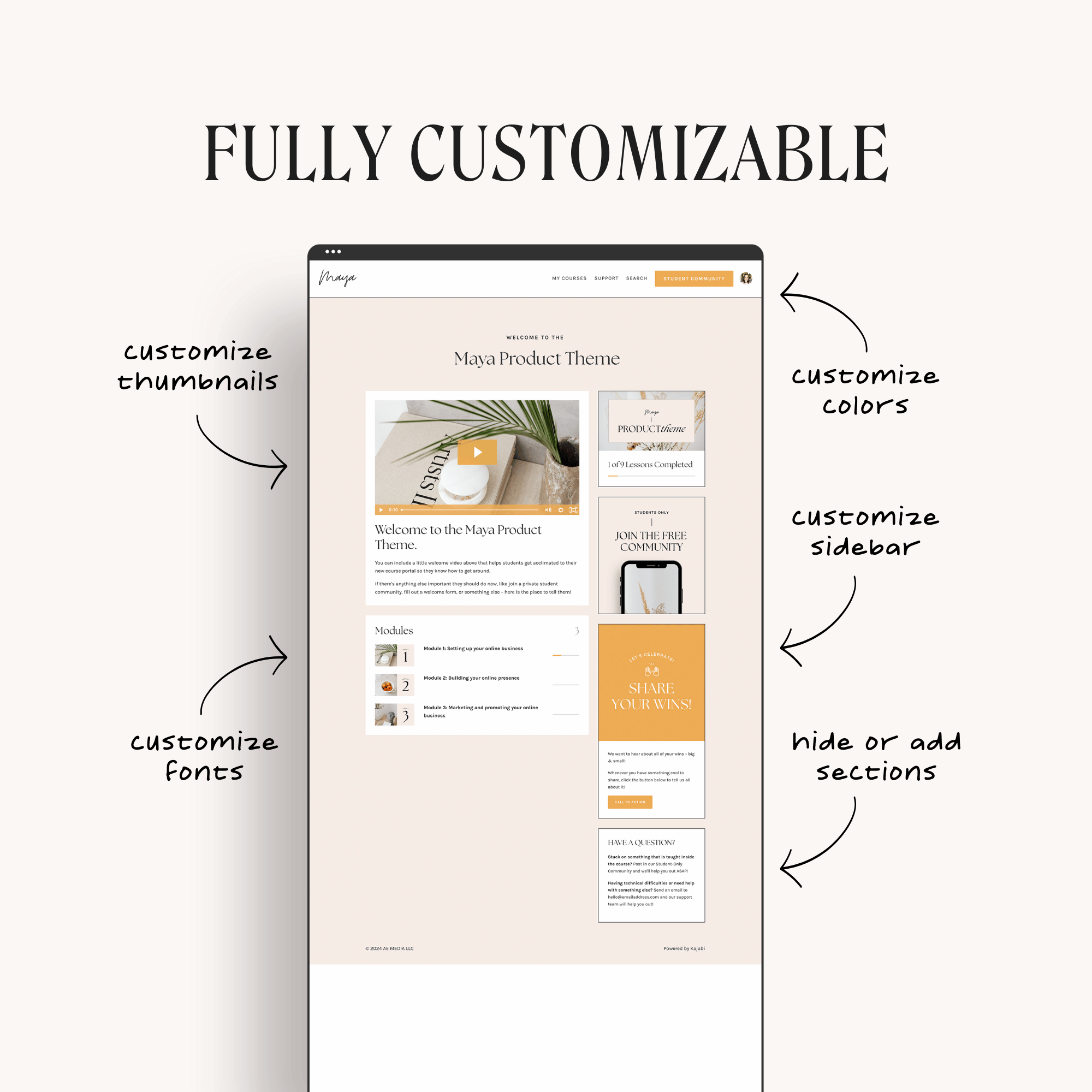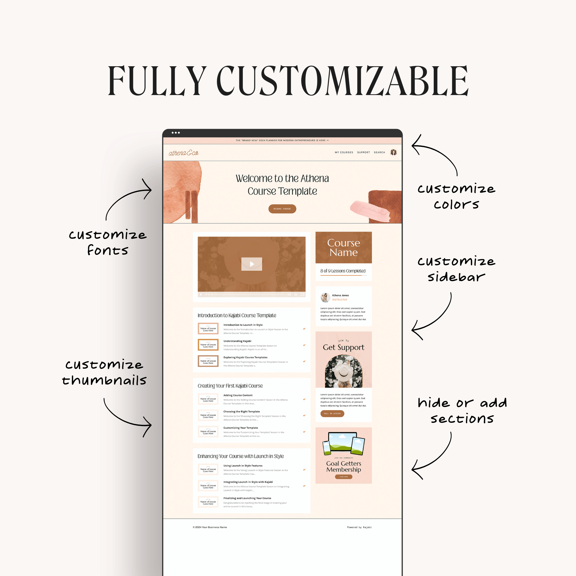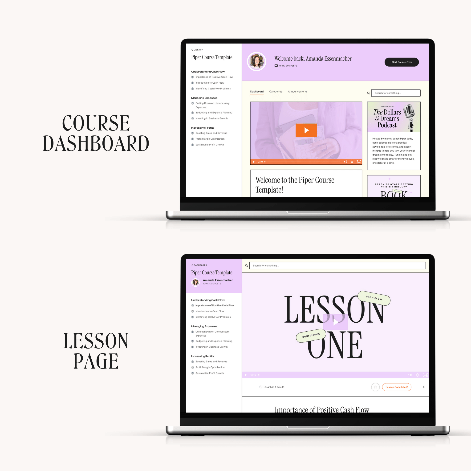 Deliver your course content in style. Our Kajabi course templates include beautiful designs for your library, product dashboard, lesson pages, and thank you page—so your students feel excited, engaged, and impressed from day one. Easy to customize and designed to elevate your student experience.