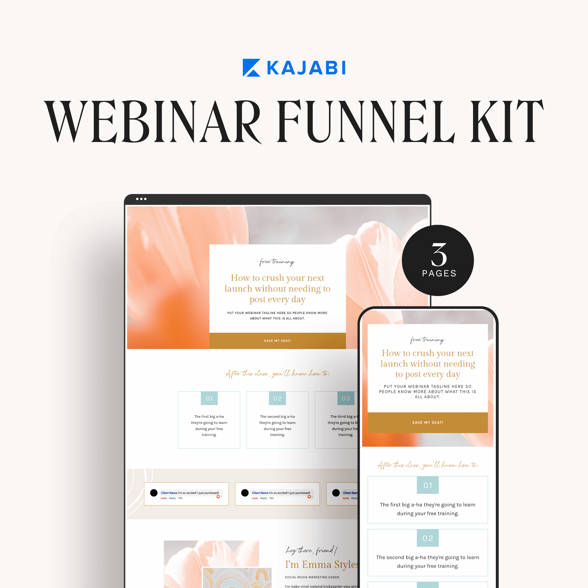 Our completely customizable and easy-to-use Kajabi Webinar Funnel Kit gives you everything you need to be able to launch an online event (like a webinar or paid training) and turn webinar attendees into course buyers without the cost of going custom or the hassle of DIY.