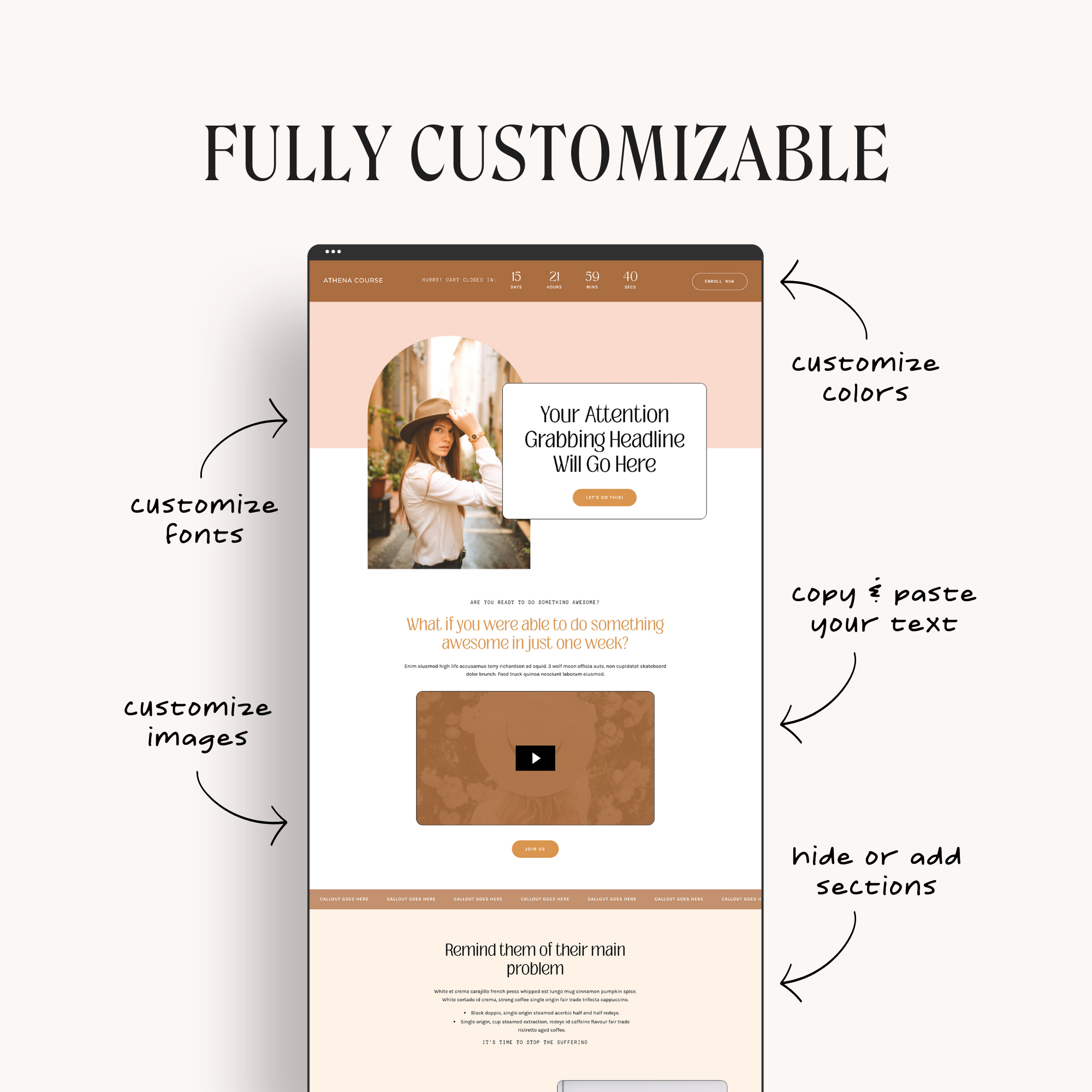 ✔️ A fully customizable Long-Form Sales Page Template for Kajabi including important sections like: Hero, The Problem, The Possible Future, The Solution, What’s Included, Bonuses, FAQs, About You, Multiple Call-to-Actions and others.